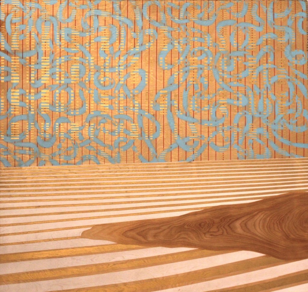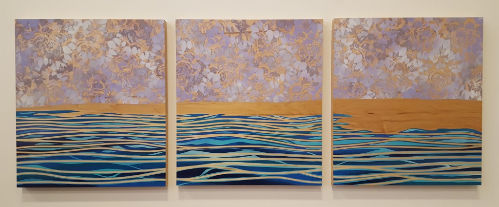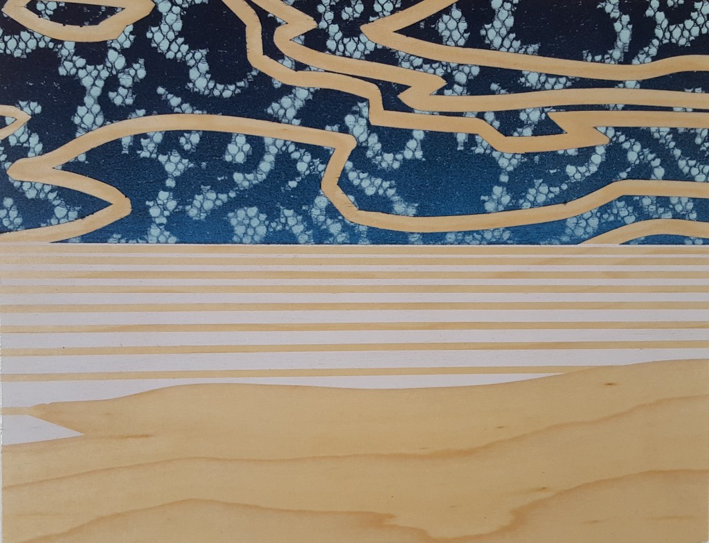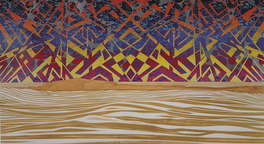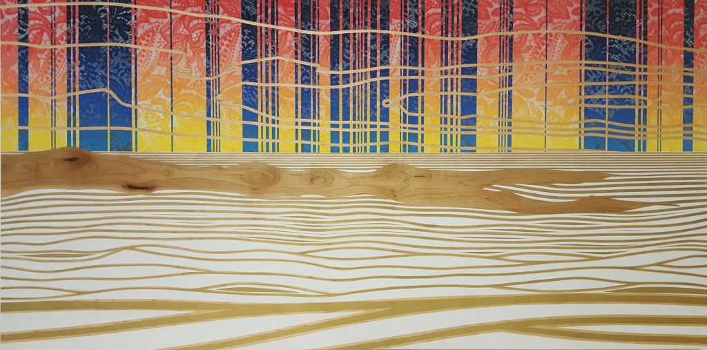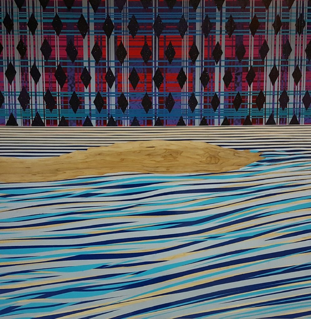 This series of paintings are organic in nature with a stylized urban perspective. These landscapes offer a sense of kaleidoscopic imagery similar to the ever changing atmosphere in and around our oceans and bodies of water. The softness of the exposed natural wood can act as a place of rest. The work shares a moment and a place in which the viewer can ponder and reflect just like the occasions we have in actual seascapes.